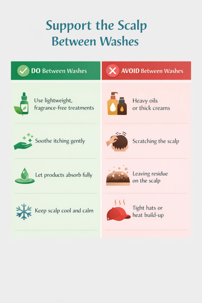 Between washes, the scalp can become dry or irritated. Product residue, heat, sweat, and ongoing inflammation can all make itching worse during this time.